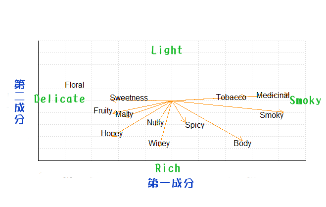 左図は各蒸溜所を場所別に色分けしています。右は各成分の方向です。精度は高くないですが、スモーキーなアイラ島のウィキーが右側に来ています。